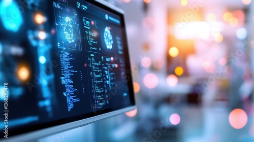 A close-up of a computer screen displaying data visualizations and code, set in a blurred, modern workspace with ambient lighting.