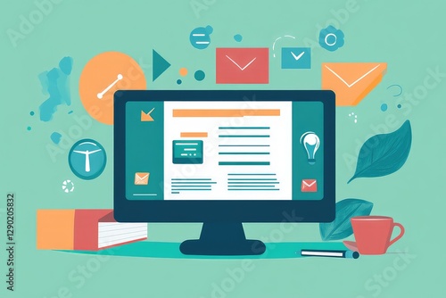 A close-up of a computer screen showing icons for e-learning, online education, and interactive courses, with an open web page on a digital device.