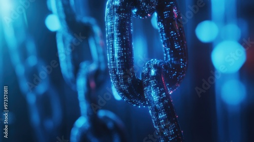 A close-up of a digital chain link with binary code glowing in blue and red lighting.