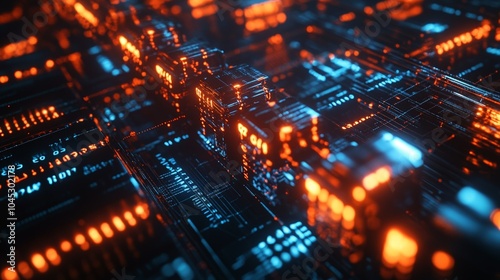 A close-up of a digital chain made of glowing blocks, symbolizing blockchain technology, with binary code and network connections in the background, illustrating the concept of data encryption