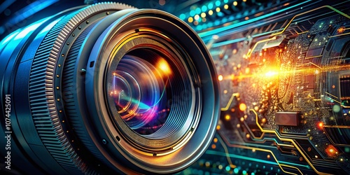 A Close-Up of a Futuristic High-Tech Camera Lens with Intricate Circuitry and Glowing Elements, Highlighting Advanced Technology and Innovative Design in a Long Exposure Setting