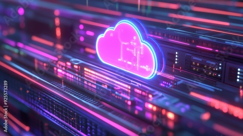 A close-up of a glowing cloud icon on a server rack, surrounded by digital lines representing data processing and storage.