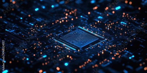 A Close-up of a Glowing Computer Chip on a Circuit Board