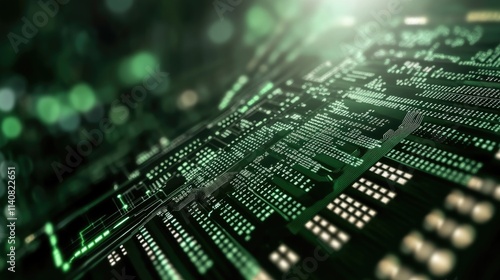 A close-up of a green stock market chart shows upward trends amidst a blurred urban background enhanced by a bokeh effect