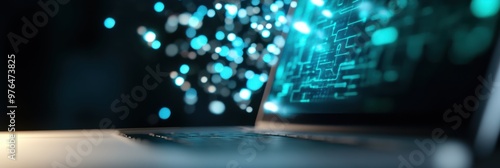 A close-up of a laptop showcases abstract blue lights and intricate digital circuits, portraying the fusion of technology and creativity in the digital age.