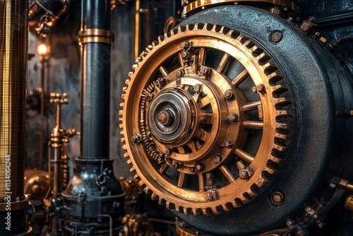 A close-up of a large, intricate gear in a mechanical setting, showcasing industrial design.