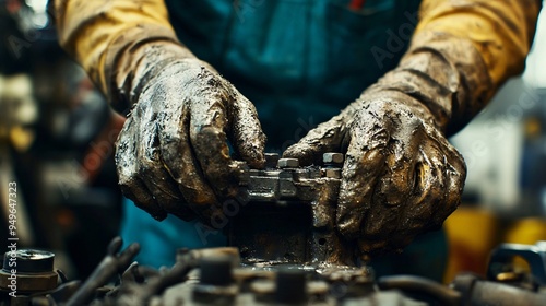 A close-up of a mechanic's hands covered in grease while repairing a car's engine block with tools in the background