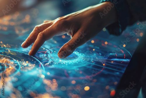 A close-up of a meteorologist's hand adjusting a satellite data feed on a touchscreen interface, focusing on precision and interaction.