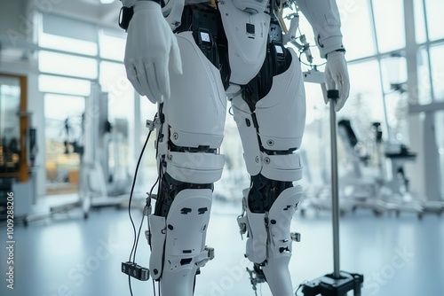 A close-up of a robotic exoskeleton designed for human assistance and mobility enhancement.