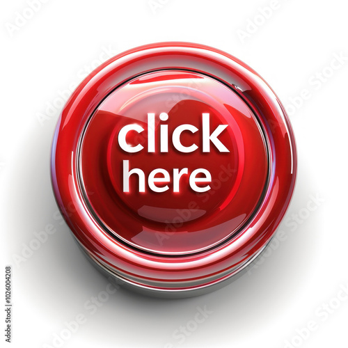 A close-up of a shiny red "Click Here" button with a computer mouse cursor hovering over it on a modern digital device screen.