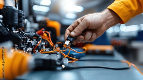 A close-up of a technician connecting a plug into an intricate circuit arrangement, highlighting technical expertise and precision in a bright laboratory setup.