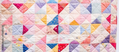 A closeup of a vibrant quilt showcasing an intricate pattern of colorful triangles, highlighting the symmetry and creative arts involved in crafting this beautiful piece of art