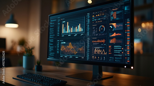 A close-up of an advanced computer monitor displaying data visualizations and graphs, with glowing UI elements and dynamic lines on the screen, set against a wooden desk background