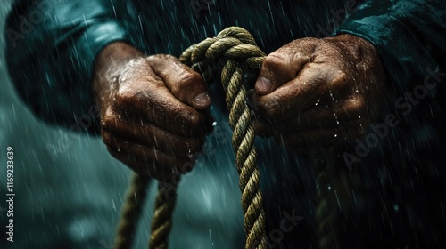A close-up of hands holding wet ropes in the rain, capturing the moment of tension and endurance in a stormy atmosphere.