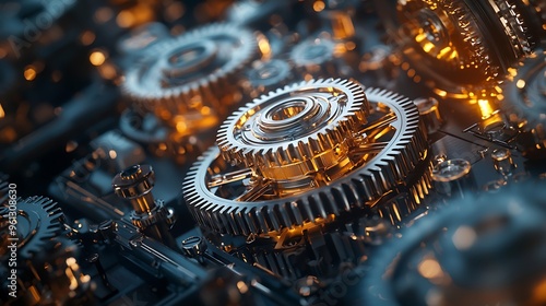 A closeup of shiny metal gears interlocking, representing precision and mechanical harmony.