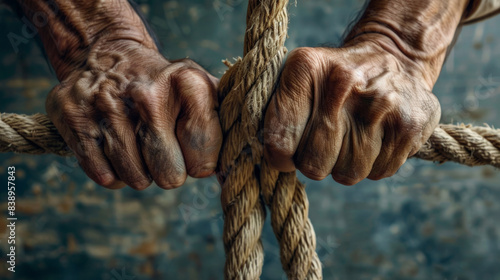 A close-up of weathered hands gripping a rope, their veins bulging, showcasing combined strength and determination