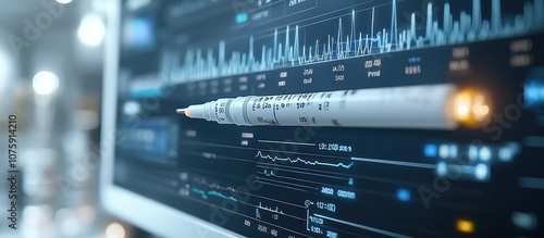 A close-up shot of a rocket passing by a computer screen displaying graphs and data
