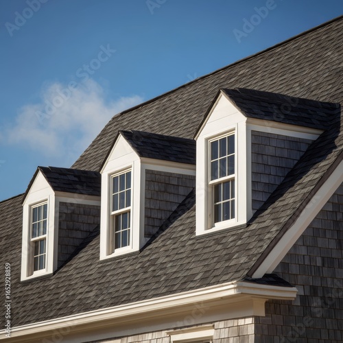 A close-up shot of a rooftop with three dormer windows against a blue sky