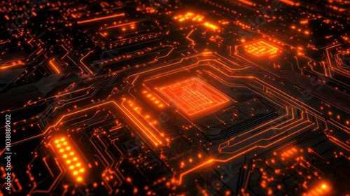 A close-up view of a circuit board with glowing orange lines and lights, illustrating technology.