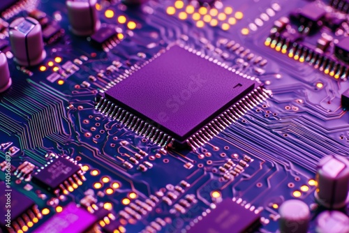 A close-up view of a colorful circuit board showcasing intricate circuitry and components, highlighting modern technology's complexity and design.