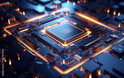 A close-up view of a computer processor surrounded by circuit components and glowing lights.