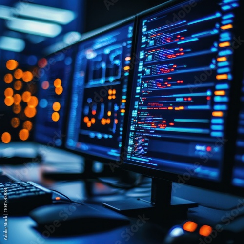 A close-up view of a computer workspace with multiple monitors displaying colorful data in a high-tech environment.