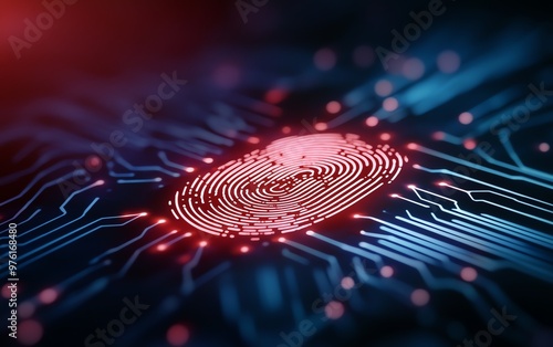 A close-up view of a fingerprint on a digital circuit background, symbolizing technology, security, and identity verification.