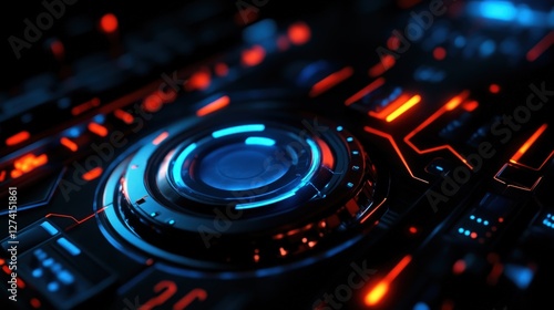 A close-up view of a futuristic control panel featuring vibrant blue and red lights. The intricate details and sleek design highlight modern technology and innovation concepts.