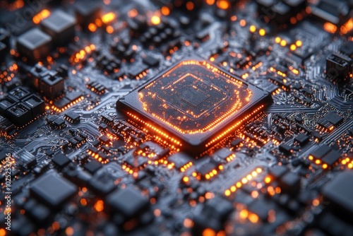 A close-up view of a glowing CPU on a circuit board, with intricate details and an orange glow.