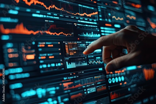 A close-up view of a hand interacting with a digital data display, showcasing vibrant graphs and analytics in a modern interface.