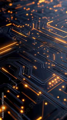 A close-up view of a modern circuit board with glowing orange lights, showcasing advanced technology and intricate design.