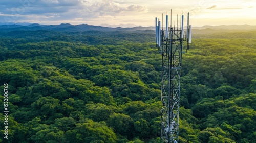A close-up view of a phone tower with antennas, set against a backdrop of green trees and clear skies, illustrating technology integrated into nature