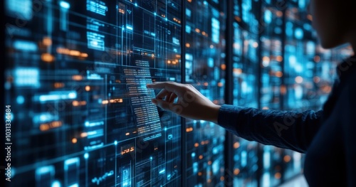 A close-up view of a user interacting with a high-fidelity digital display, selecting data rows from a modern database interface, showcasing advanced technology and design.