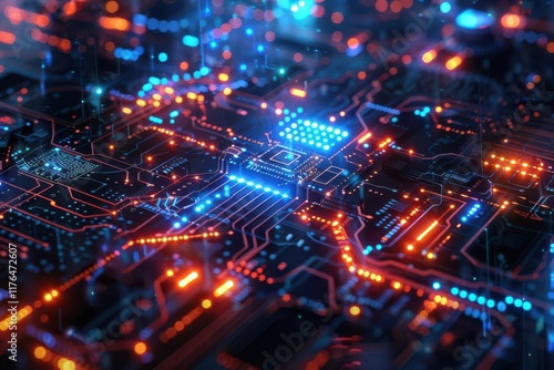 A close-up view of a vibrant circuit board with glowing lights and intricate pathways.
