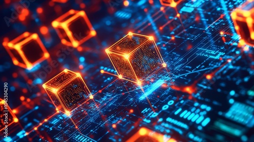 A close-up view of blockchain technology, with 3D cubes linked by glowing lines, floating in a virtual space surrounded by binary code and data points, representing secure data transactions