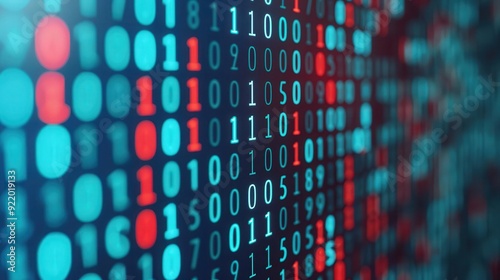 A close-up view of digital binary code, highlighted in red and blue, representing data processing and technology concepts.