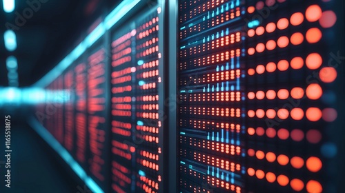 A close-up view of illuminated server racks, showcasing red and blue lights in a modern data center, emphasizing technology and digital infrastructure.