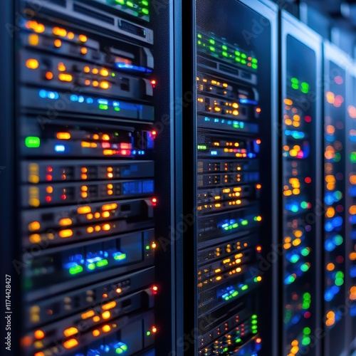 A close-up view of illuminated server racks, showcasing various colorful lights indicating activity and functionality.