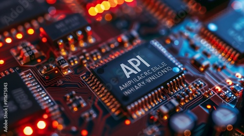 A close-up view with the acronym ''API'' displayed on a microchip, representing the concept of Application Programming Interface.