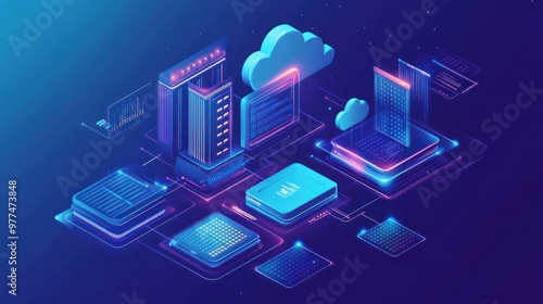 A cloud computing interface showcasing virtual servers, cloud storage, and real-time data analytics, optimizing IT infrastructure for cloud-based solutions.