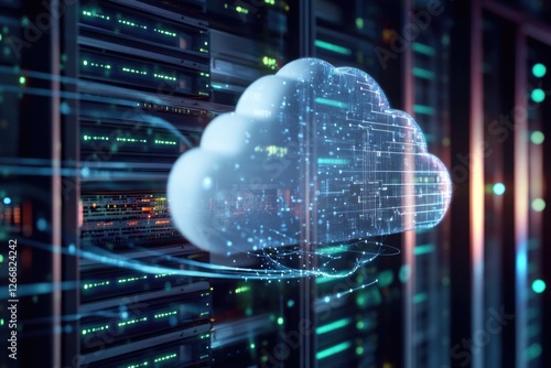 A cloud floats above a server in a data center, representing cloud computing and virtualization