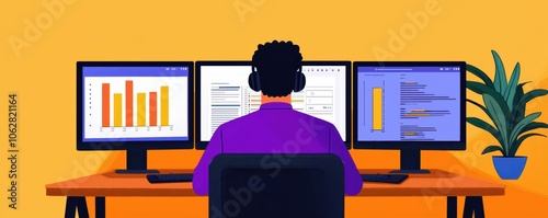 A coder debugging a sophisticated application on multiple screens hard skills coding tools
