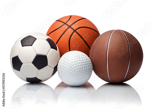 A collection of sports balls including a soccer ball basketball football and a golf ball on white