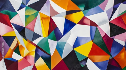 A colorful abstract painting with many different shapes and colors