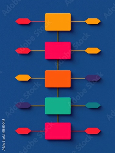 A colorful flowchart design on a blue background, featuring various boxes connected by arrows, representing a structured process or workflow.