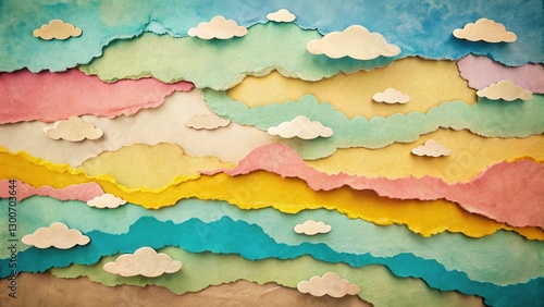 A colorful mix of paper textures and pastel hues on a vintage-style poster background with stylized clouds created from torn and layered paper shapes, artistic style , mixed media