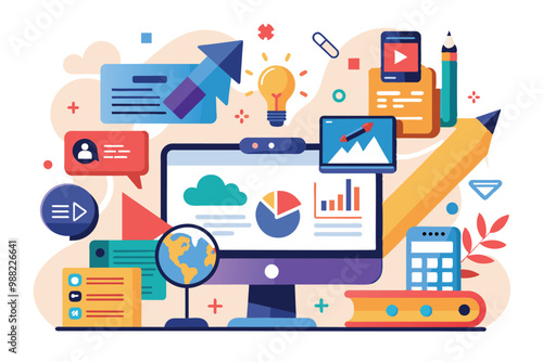 A colorful workspace captures various digital tools aiding in content creation, analytics, and communication displayed on a central computer.