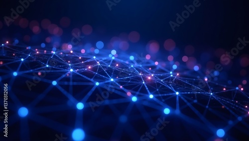 a complex network of interconnected points, representing data flow and technological advancement. The image displays a vibrant, abstract view of a digital network, with glowing nodes and lines