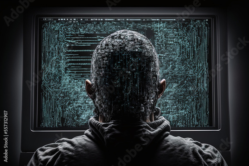 a composite photograph of a hacker utilizing a computer screen. Generative AI