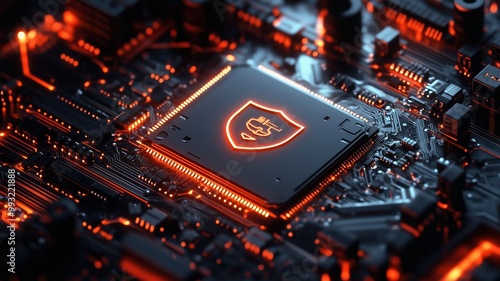A computer chip with a red shield on it